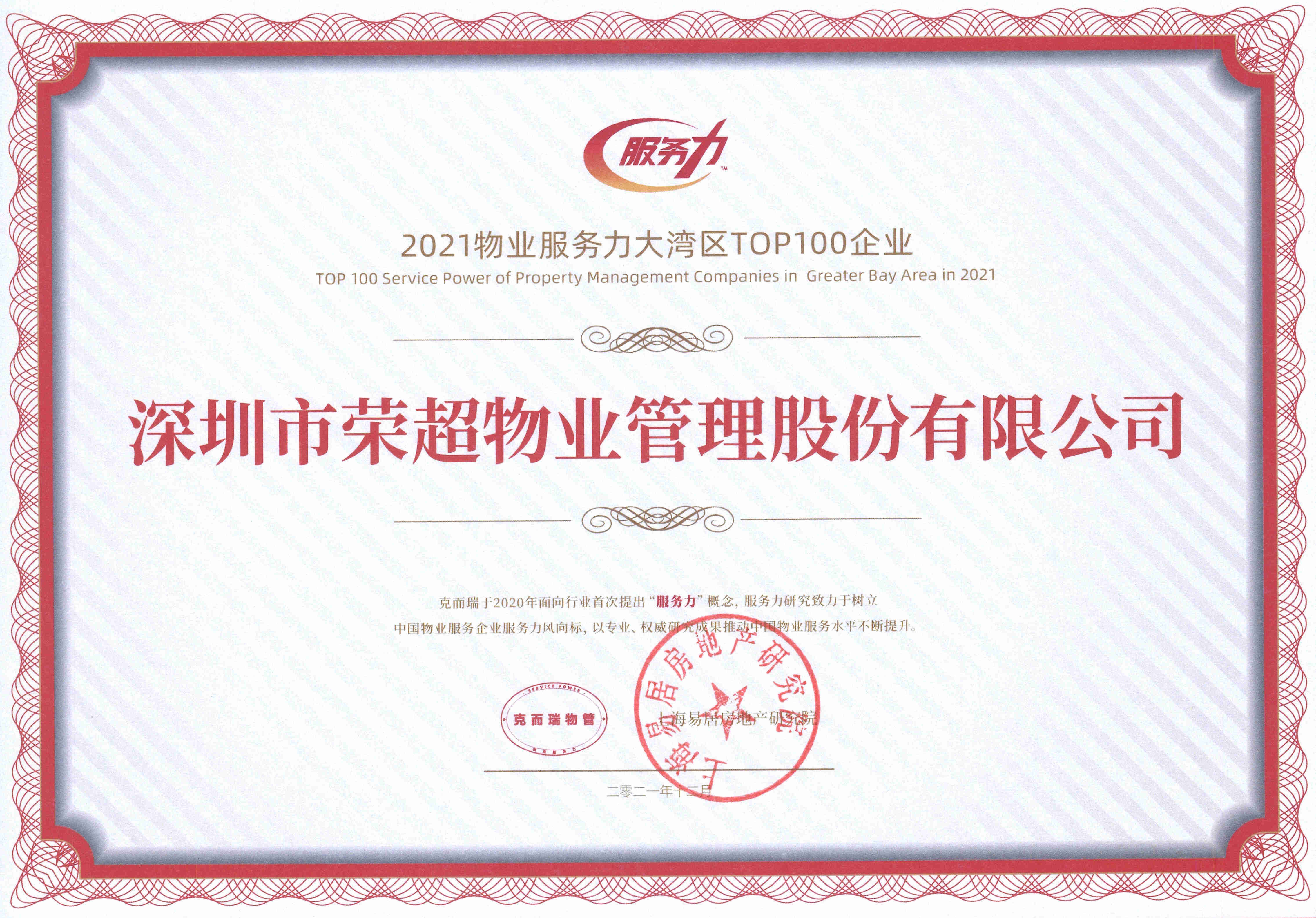 会上,克而瑞物管发布了《2021物业服务力大湾区TOP100企业》榜单,凭借领先的综合实力和良好的品牌口碑,荣超物业荣获“2021物业服务力大湾区TOP100企业”荣誉。